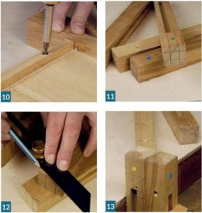 11. Before assembling the frame, mark out for the chamfer detail on the top of the four corner posts. Use a marking gauge to divide the end of the post into an even pattern.